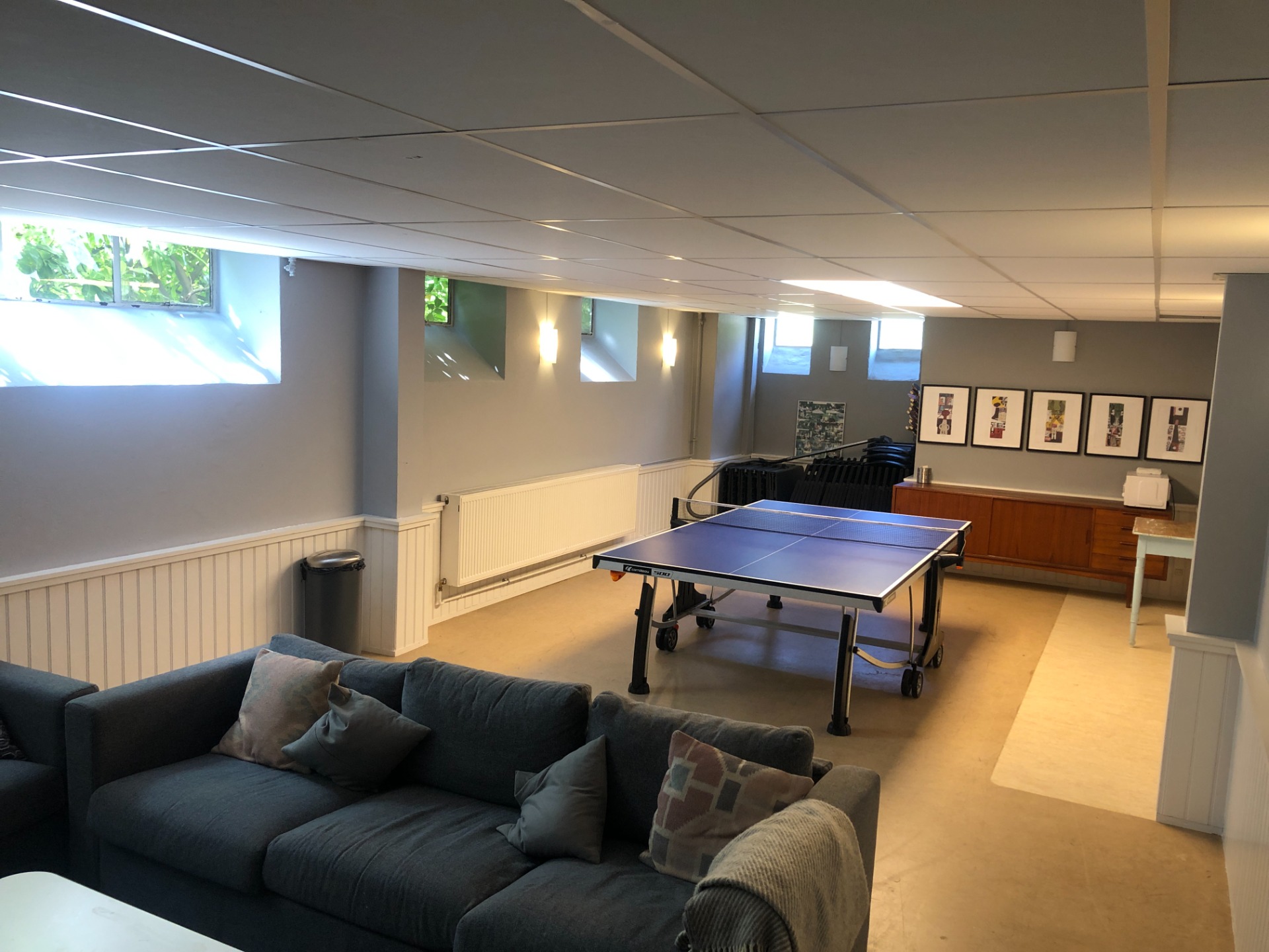 Her det muligt og afholde selskaber, se TV samt spille bordtennis. Der er borde og stole til ca. 30 personer samt et lille køkken som ligger overfor her er 2 køleskabe, kaffemaskine samt opvaskemaskine